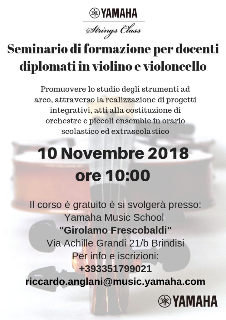 L’anno accademico 2018.19 della Scuola di Musica “G. Frescobaldi” di Brindisi riparte con alcune importanti novità. E’ fissato per la giornata di sabato 10 novembre un seminario di formazione per docenti diplomati in violino e violoncello a cura della Yamaha Music Foundation: “String Class” è un’iniziativa gratuita per tutti i partecipanti e finalizzata a promuovere lo studio degli strumenti ad arco attraverso la realizzazione di progetti integrativi atti alla costituzione di orchestre e piccoli ensemble in orario scolastico ed extrascolastico.